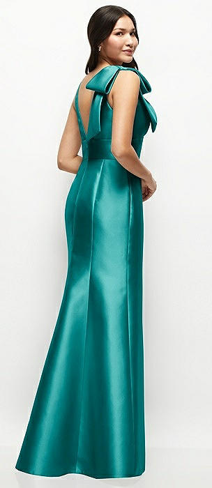 Deep V-back Satin Trumpet Dress with Cascading Bow at One Shoulder in jade