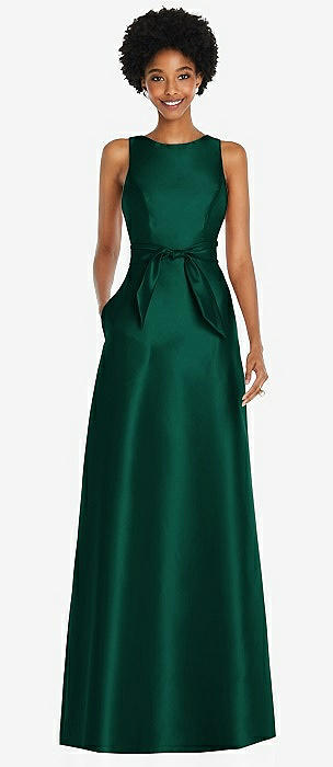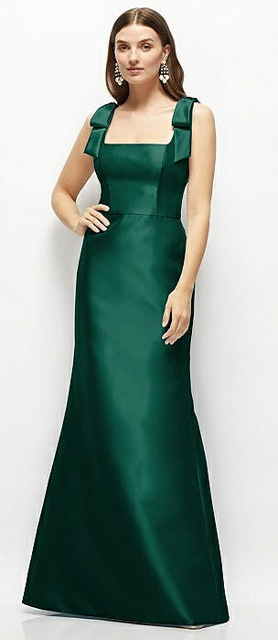 Bateau Neck Satin Column Maxi Dress with Exaggerated Tail Bow Straps in hunter green
