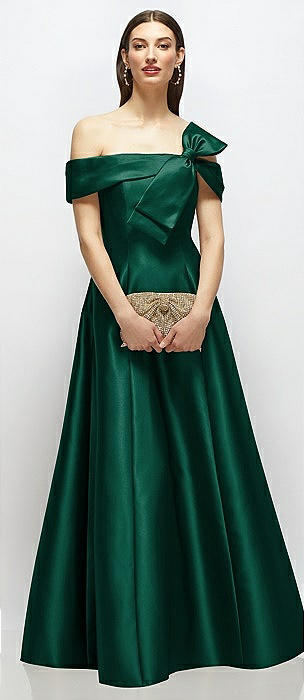 Asymmetrical Bow Off-Shoulder Satin Gown with Ballroom Skirt in hunter green