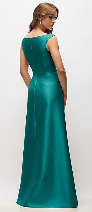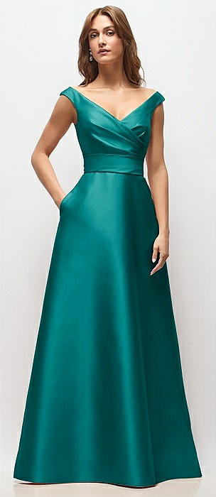 Off-the-Shoulder Draped Wrap Satin Maxi Dress in jade