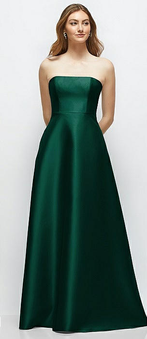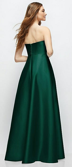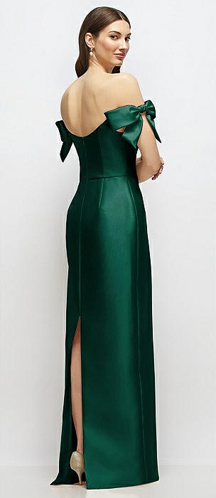Basque-Neck Satin Column Maxi Dress with Off-the-Shoulder Bows in hunter green
