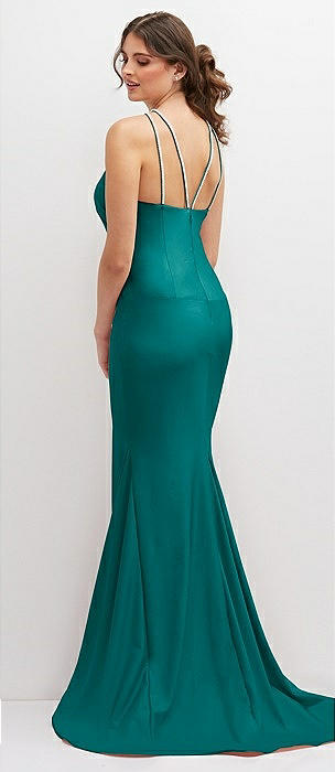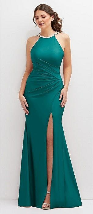 Halter Asymmetrical Draped Stretch Satin Mermaid Dress with Rhinestone Straps in peacock teal