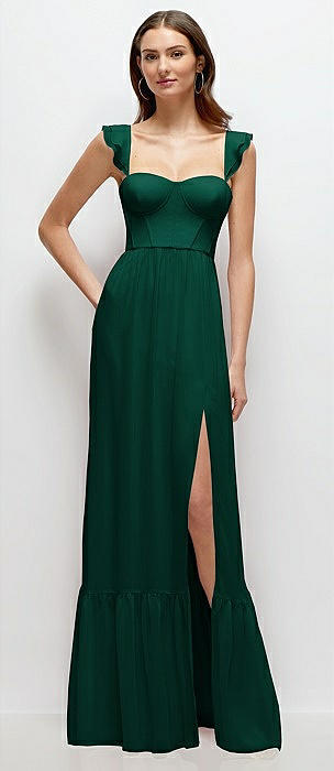 Ruffle Strap Chiffon Bustier Maxi Dress with Ruffle Hem A-Line Skirt in hunter green