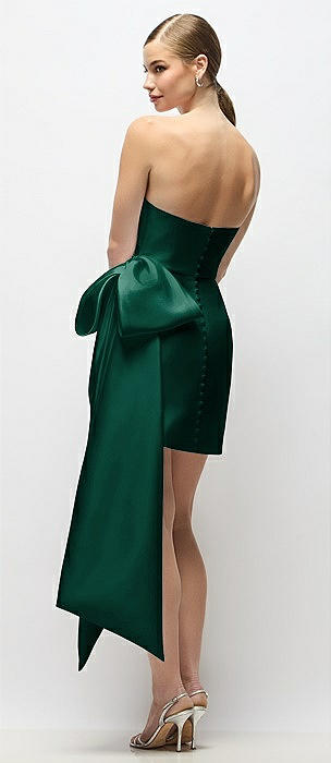 Strapless Pleated Draped Satin Mini Dress with Dramatic Long Tail Bow & Covered Buttons in hunter green