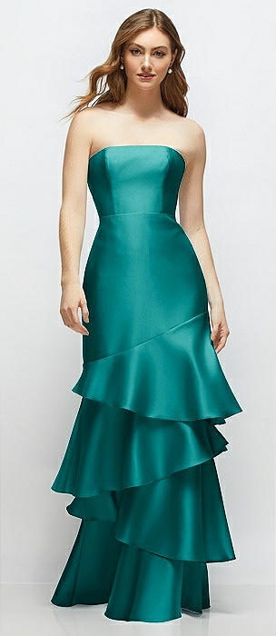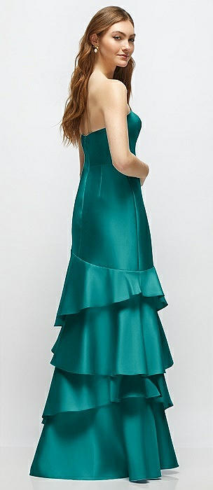 Bow-Shoulder Satin Maxi Dress with Asymmetrical Tiered Skirt in jade
