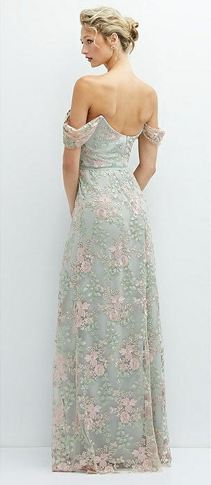 Off-the-Shoulder A-line Floral Embroidered Dress with Skinny Tie Sash in willow green
