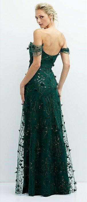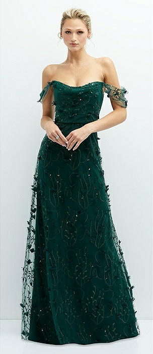 Off-the-Shoulder A-line 3D Floral Embroidered Dress in evergreen