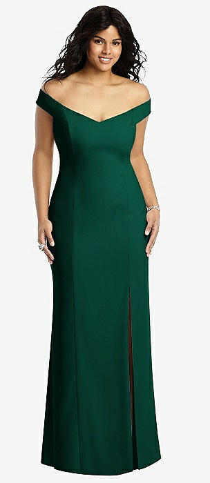Off-the-Shoulder Criss Cross Back Trumpet Gown in hunter green