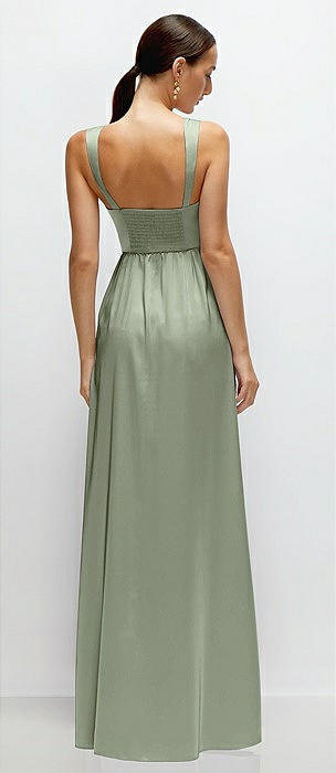 Shaped Strap Portrait Neckline Fluid Satin Maxi Dress with Full Skirt in sage