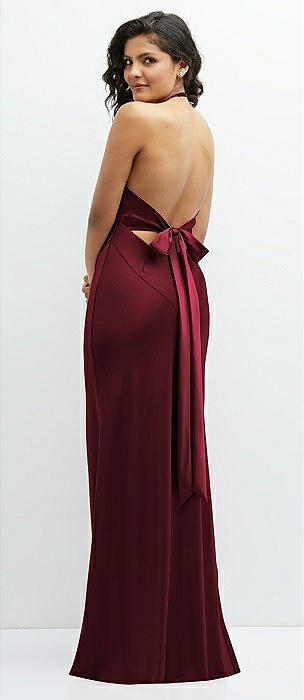 Plunge Halter Open-Back Maxi Bias Dress with Low Tie Back in cabernet