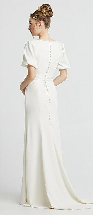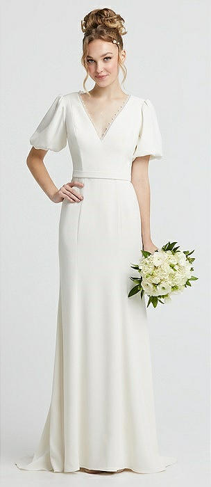 Pearl Trimmed V-Neck Mermaid Wedding Dress with Bell Sleeves in ivory