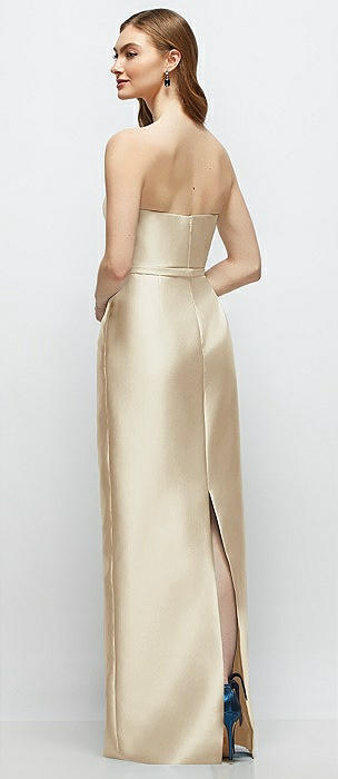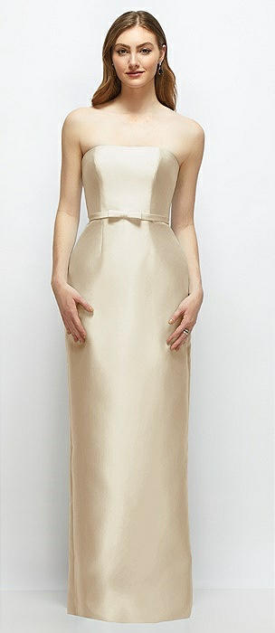 Bateau Neck Satin Column Dress with Bow-Trimmed Skinny Belt in champagne