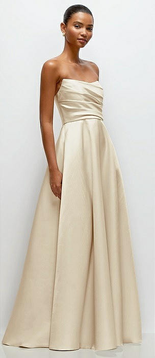 Strapless Draped Cat-Eye Satin Maxi Dress with Full Skirt in champagne