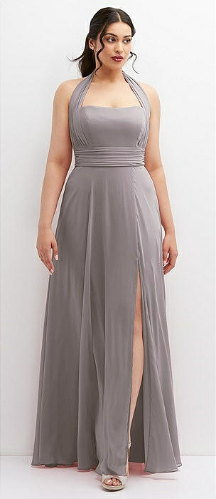Halter Asymmetrical Draped Stretch Satin Mermaid Dress with Rhinestone Straps in cashmere gray