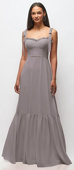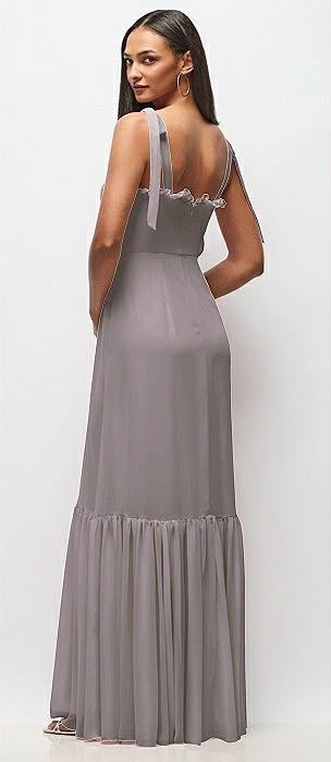 Tie-Shoulder Bustier Bodice Ruffle-Hem Maxi Dress in cashmere gray
