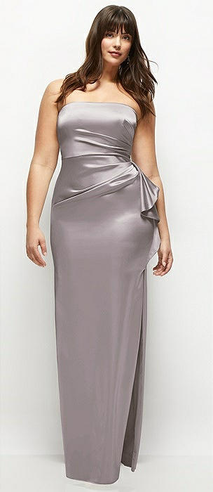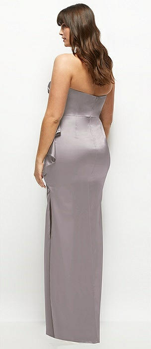 Strapless Draped Skirt Satin Maxi Dress with Cascade Ruffle in cashmere gray