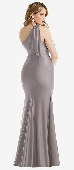 Cascading Bow One-Shoulder Stretch Satin Mermaid Dress with Slight Train in cashmere gray