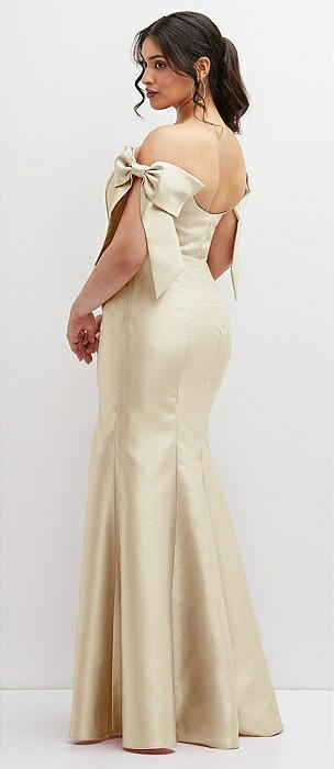 Off-the-Shoulder Ruffle Neck Satin Trumpet Gown in champagne