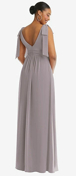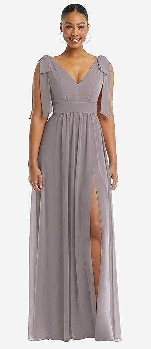 Plunge Neckline Bow Shoulder Empire Waist Chiffon Maxi Dress in cashmere gray