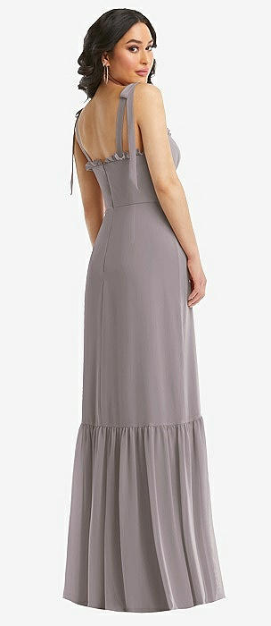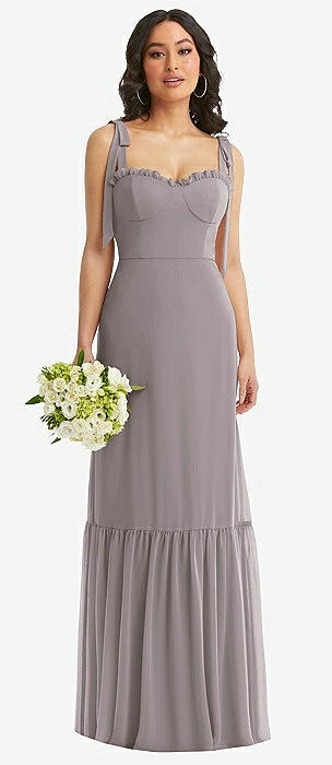 Tie-Shoulder Bustier Bodice Ruffle-Hem Maxi Dress in cashmere gray
