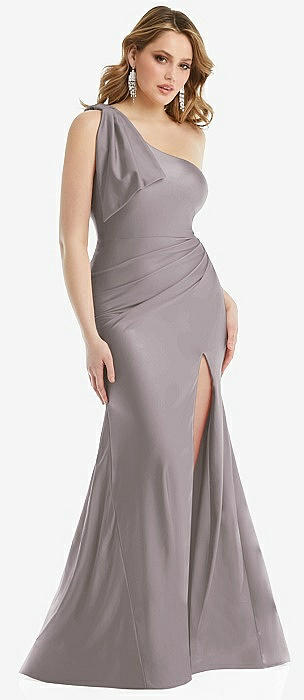 Cascading Bow One-Shoulder Stretch Satin Mermaid Dress with Slight Train in cashmere gray