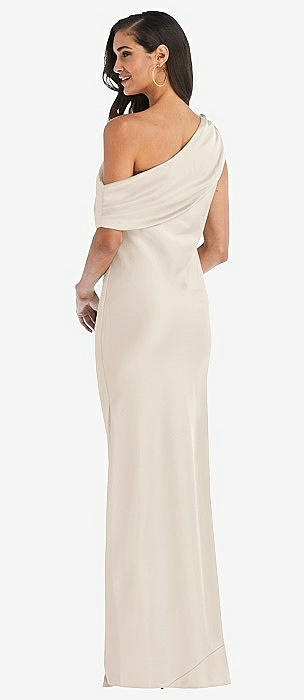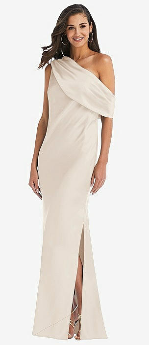 Asymmetrical One-Shoulder Cowl Maxi Slip Dress in oat