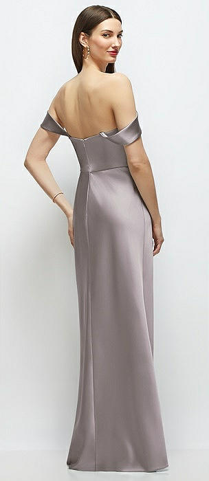 Basque-Neck A-Line Stretch Satin Maxi Dress with Off-the-Shoulder Drape in cashmere gray