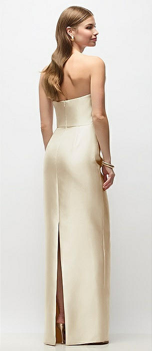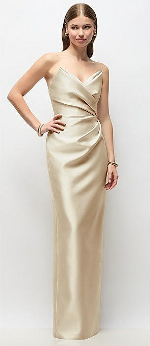 Strapless Asymmetrical Draped Satin Column Maxi Dress in champagne