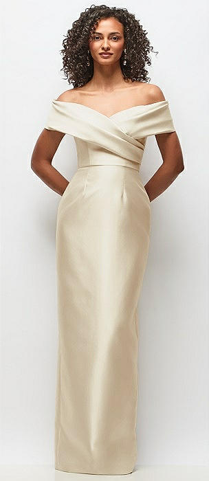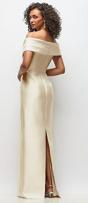 Basque-Neck Satin Column Maxi Dress with Off-the-Shoulder Bows in champagne