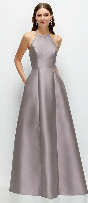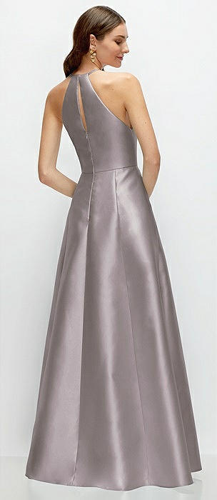 Jewel Neck Halter Full A-Line Satin Maxi Dress in cashmere gray