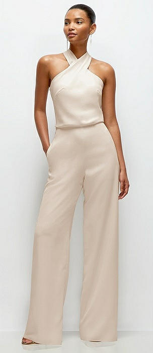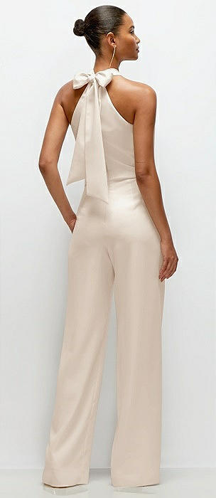 Pleated Halter Blouson Crepe Wedding Jumpsuit with Self-Tie Bow Back in oat