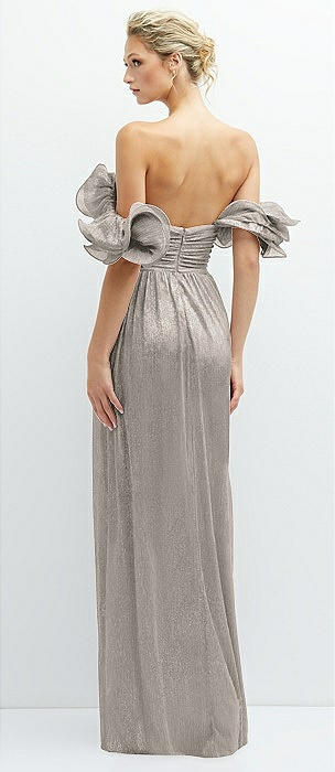 Dramatic Ruffle Edge Convertible Strap Metallic Pleated Maxi Dress in metallic taupe