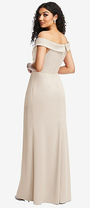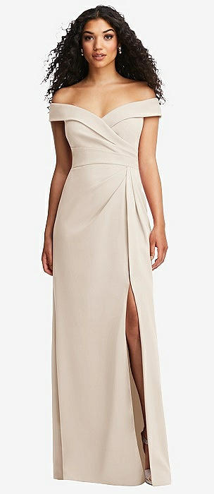 Cuffed Off-the-Shoulder Pleated Faux Wrap Maxi Dress in oat