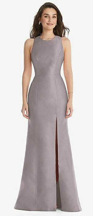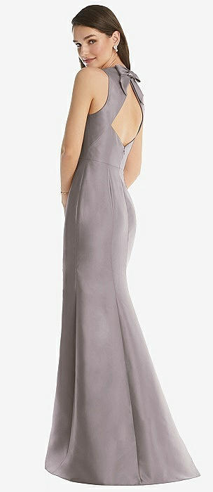 Jewel Neck Bowed Open-Back Trumpet Dress with Front Slit in cashmere gray
