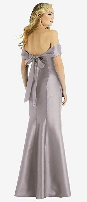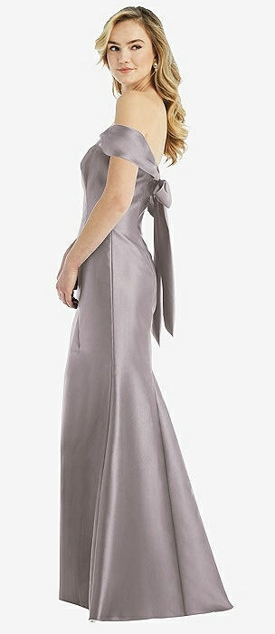 Off-the-Shoulder Bow-Back Satin Trumpet Gown in cashmere gray