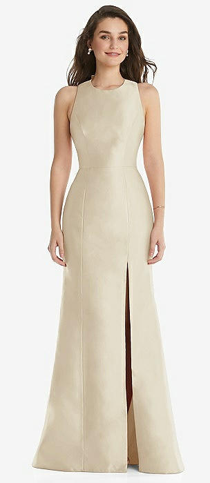 Jewel Neck Bowed Open-Back Trumpet Dress with Front Slit in champagne