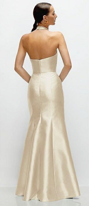 High-Neck Halter Open-Back Satin Trumpet Dress in champagne