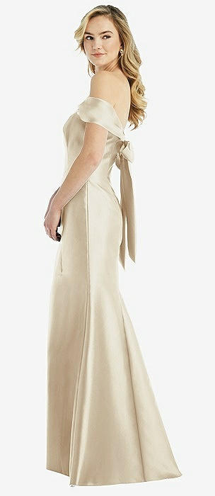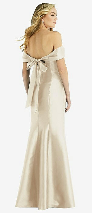 Off-the-Shoulder Bow-Back Satin Trumpet Gown in champagne