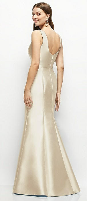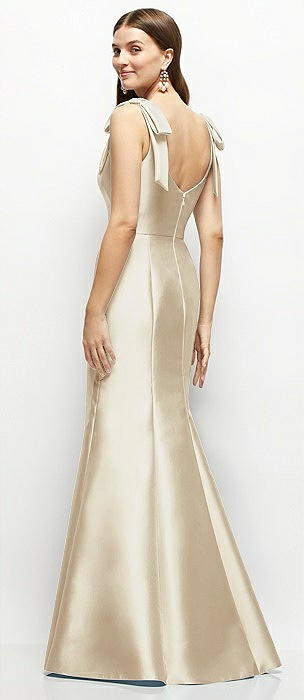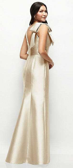 Deep V-back Satin Trumpet Dress with Cascading Bow at One Shoulder in champagne