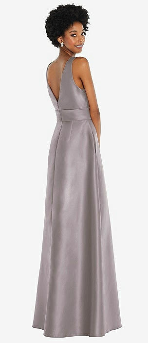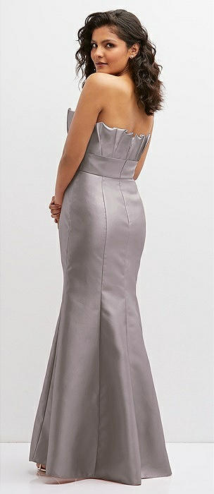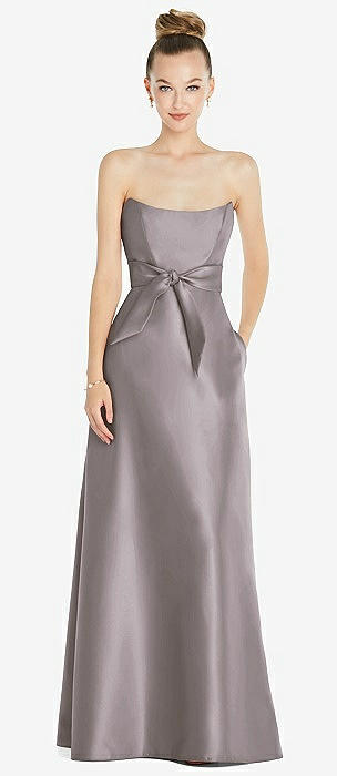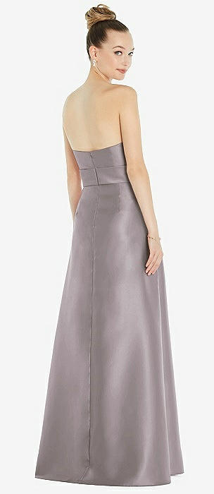 Basque-Neck Strapless Satin Gown with Mini Sash in cashmere gray