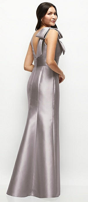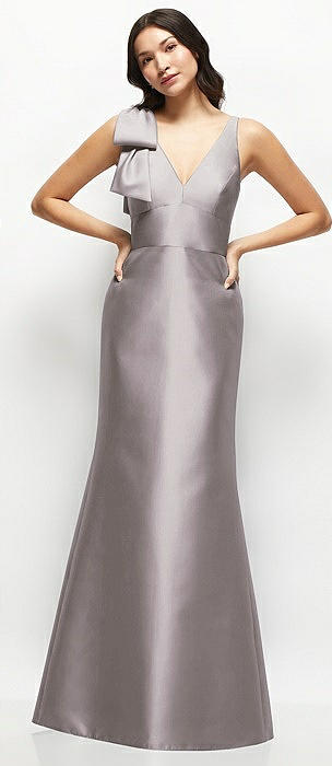 Deep V-back Satin Trumpet Dress with Cascading Bow at One Shoulder in cashmere gray
