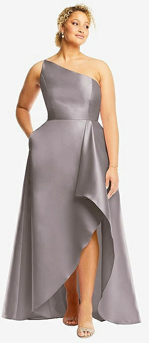 One-Shoulder Satin Gown with Draped Front Slit and Pockets in cashmere gray
