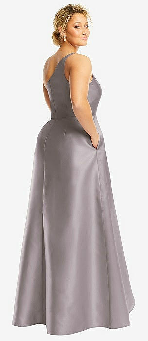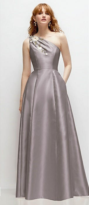 One-Shoulder Full A-Line Satin Gown with Handworked Floral Appliqué in cashmere gray