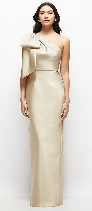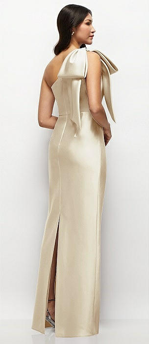 Oversized Bow One-Shoulder Satin Column Maxi Dress in champagne