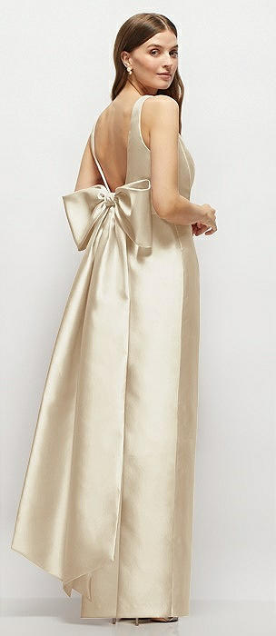 Scoop Neck Corset Satin Maxi Dress with Floor-Length Bow Tails in champagne