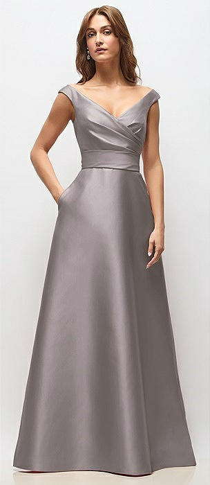 Off-the-Shoulder Draped Wrap Satin Maxi Dress in cashmere gray