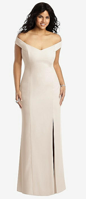 Off-the-Shoulder Criss Cross Back Trumpet Gown in oat
