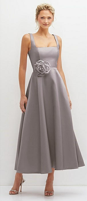 Square Neck Satin Midi Dress with Full Skirt & Flower Sash in cashmere gray