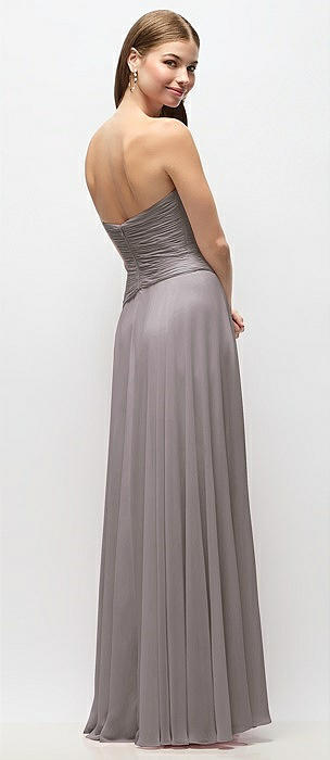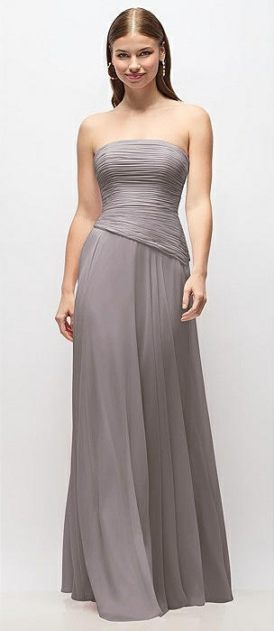 Strapless Chiffon Maxi Dress with Asymmetrical Ruched Drop Waist in cashmere gray