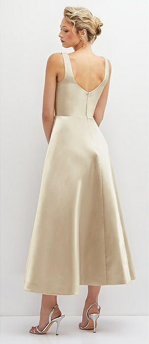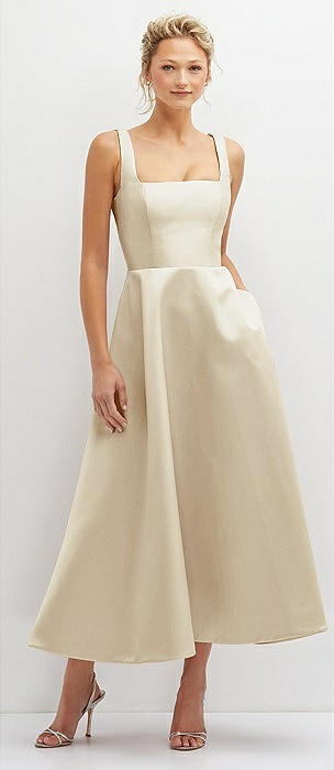 Square Neck Satin Midi Dress with Full Skirt & Pockets in champagne